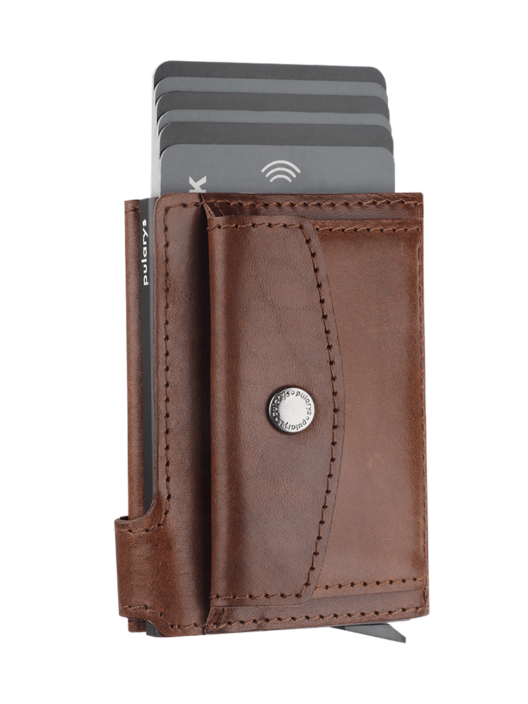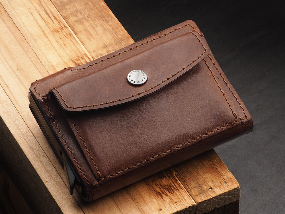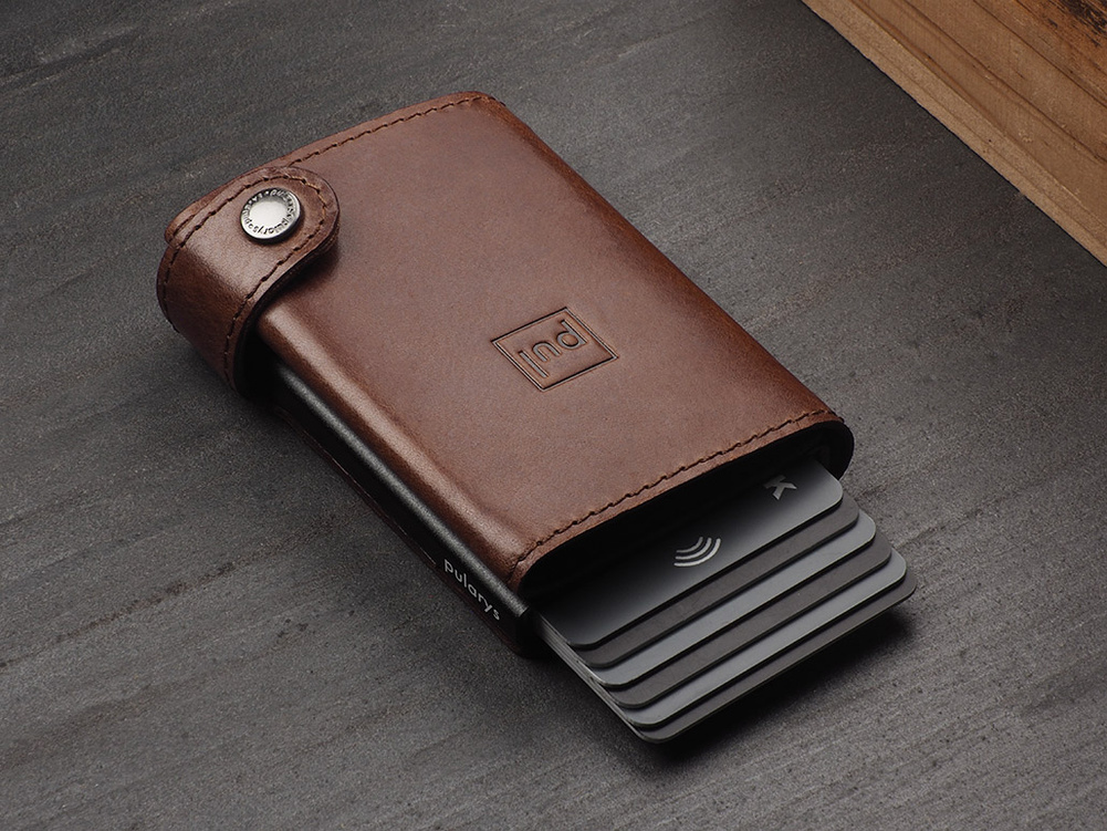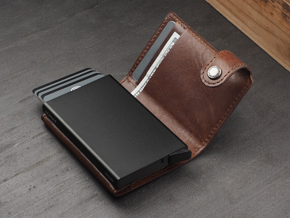 Mechanizm z dźwignią w aluminiowym etui portfela został zaprojektowany tak, aby nawet po długim czasie użytkowania pewnie trzymać karty płatnicze.