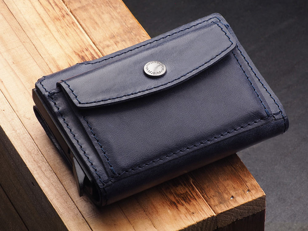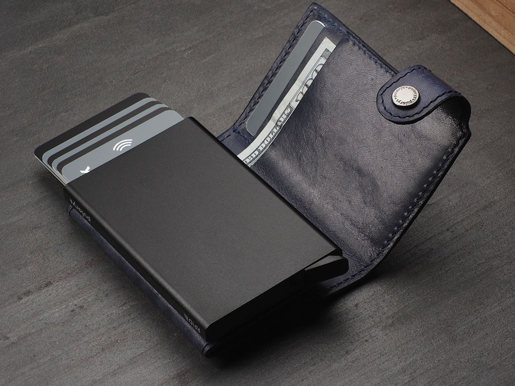 Mechanizm z dźwignią w aluminiowym etui portfela został zaprojektowany tak, aby nawet po długim czasie użytkowania pewnie trzymać karty płatnicze.