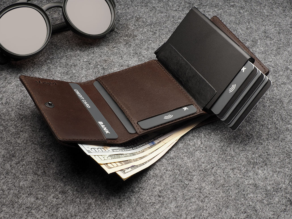 Przechowa wiele kart płatniczych i dokumentów. Specjalny mechanizm stopniowego wysuwania kart -zapewnia do nich szybki i łatwy dostęp. Elegancka funkcjonalność tego portfela to również dodatkowa, obszerna kieszeń na banknoty oraz klapka zapinana na zatrzask. Dzięki zastosowanej w jego konstrukcji technologii blokowania RFID, Twoje wrażliwe dane oraz środki na kartach płatniczych są całkowicie bezpieczne i chronione przed nieautoryzowanym skanowaniem lub kradzieżą.