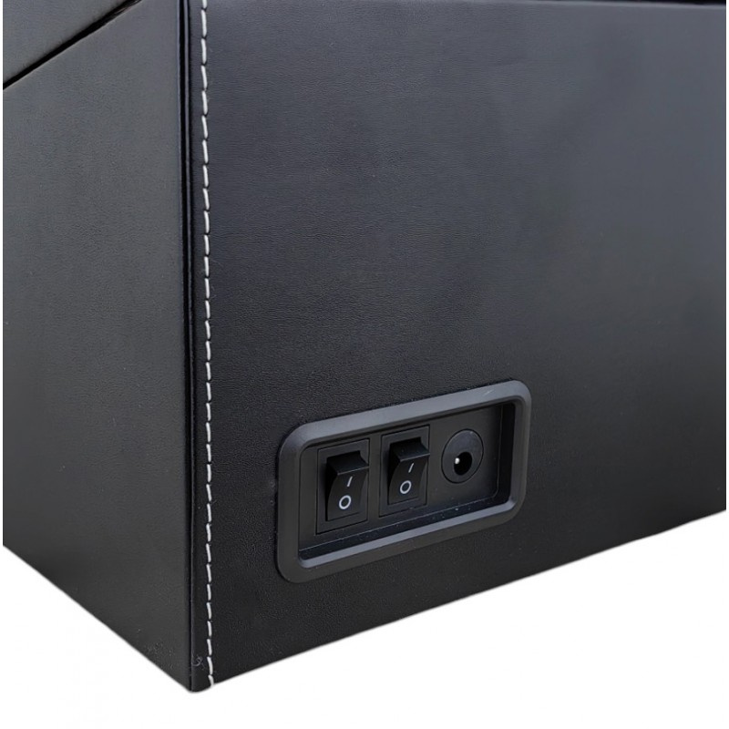 wyścielone miękką ekoskórą - szybka prezentująca zegarki - Zasilacz w zestawie Wymiary: Szerokość - 31 cm Głębokość - 23,8  cm Wysokość - 12,5 - 18 cm Wymiary