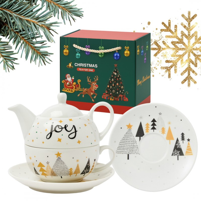 DZBANEK CERAMICZNY Z FILIŻANKĄ I TALERZYKIEM Zestaw z motywem świątecznym Idealny gadżet dla każdego miłośnika kawy czy herbaty.