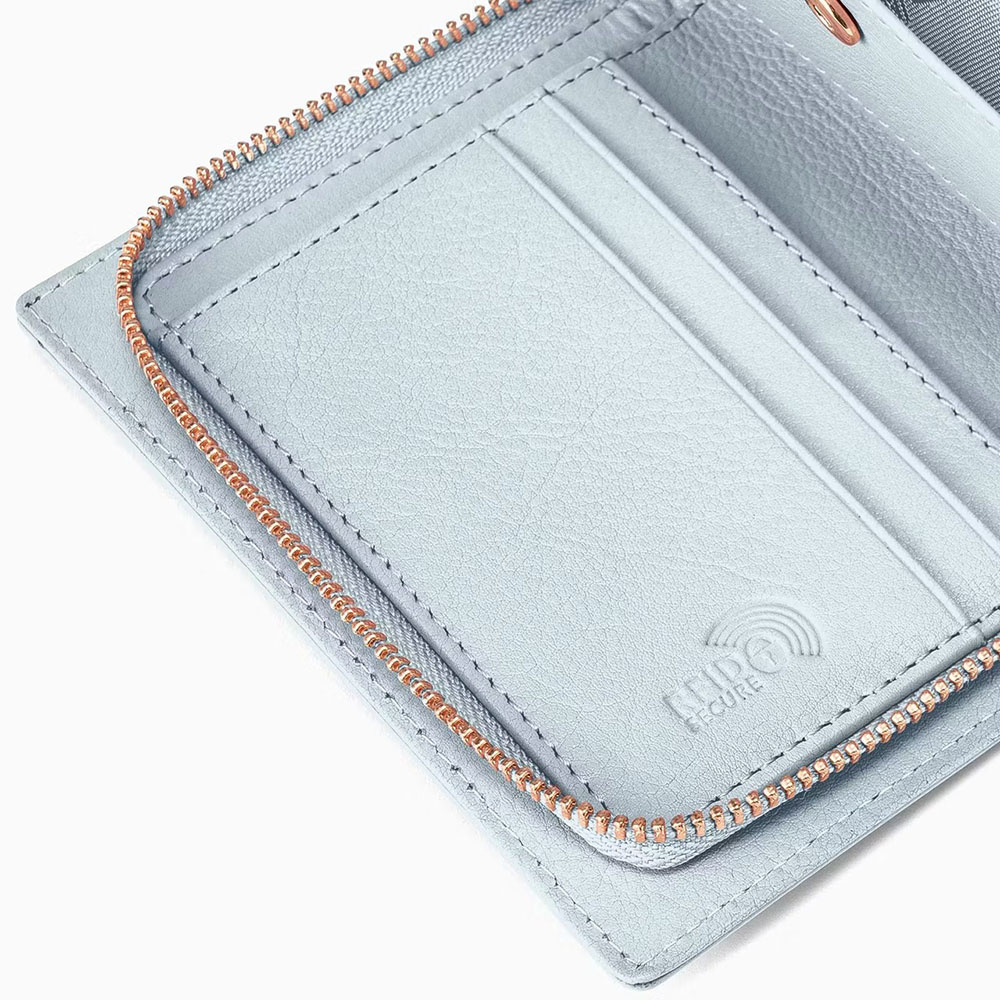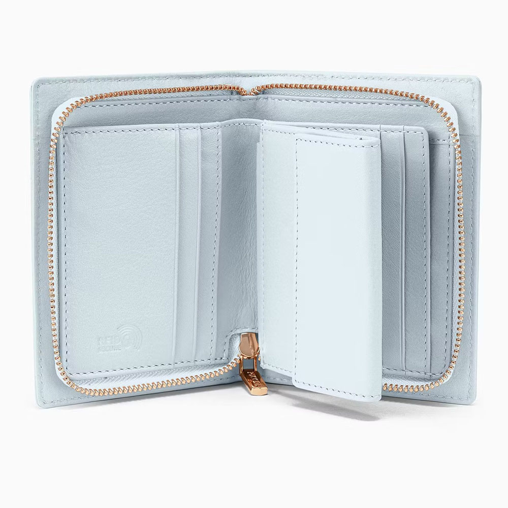 Dzięki średniemu rozmiarowi portfel doskonale mieści się w dłoni i w torebce, zapewniając pełen komfort użytkowania. Wnętrze zaprojektowano tak, by pomieściło wszystko, co najważniejsze – miejsce na banknoty, sześć przegródek na karty lub wizytówki oraz kieszonkę na bilon zapinaną na zatrzask. Całość zabezpieczono praktycznym zamkiem, który chroni zawartość przed wypadnięciem.