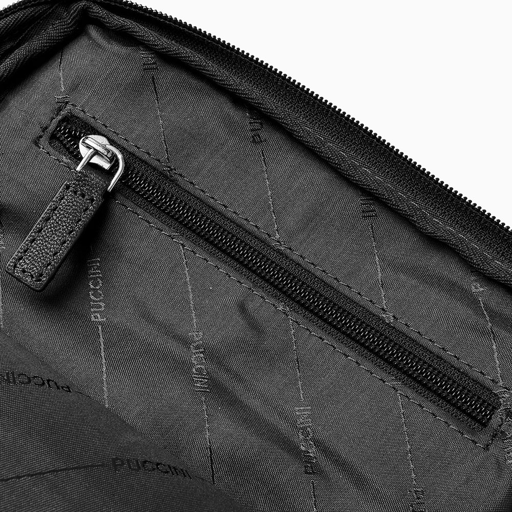 Model oferuje dobrze zorganizowane wnętrze, które z łatwością pomieści wszystkie niezbędne drobiazgi. Liczne kieszenie wewnętrzne i zewnętrzne ułatwiają utrzymanie porządku, a regulowany pasek zapewnia komfort noszenia dopasowany do indywidualnych preferencji. Elegancka, logowana podszewka oraz srebrne elementy metalowe podkreślają wysoką jakość wykonania.
