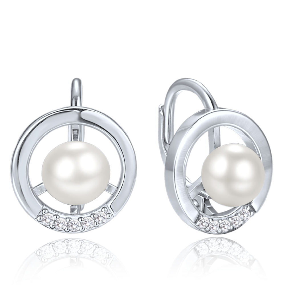 Eleganckie srebrne kolczyki MINET ze srebra Ag 925/1000 z kółkiem, perłą i cyrkoniami mają rodowaną powierzchnię i zapięcie patentowe.