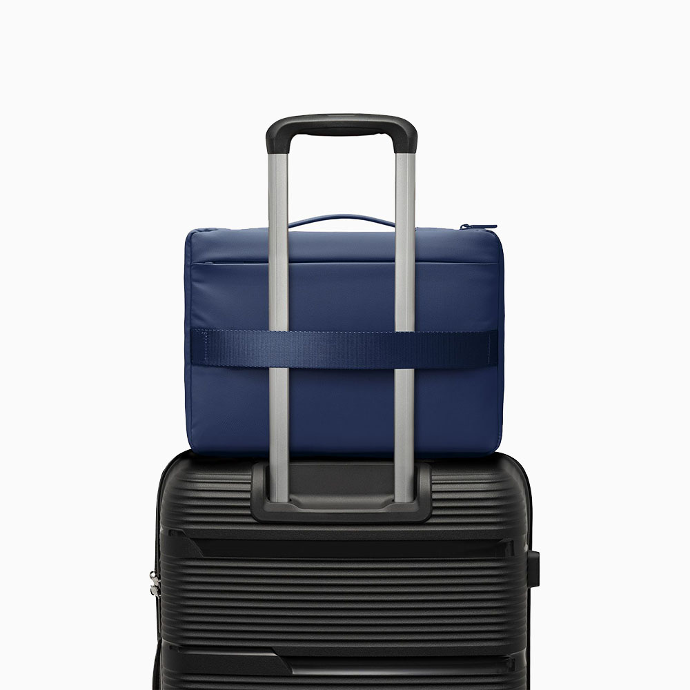 Etui wyposażono w wygodny uchwyt do noszenia w dłoni oraz praktyczny pas umożliwiający zamocowanie go na stelażu walizki, co znacząco ułatwia transport w podróży.