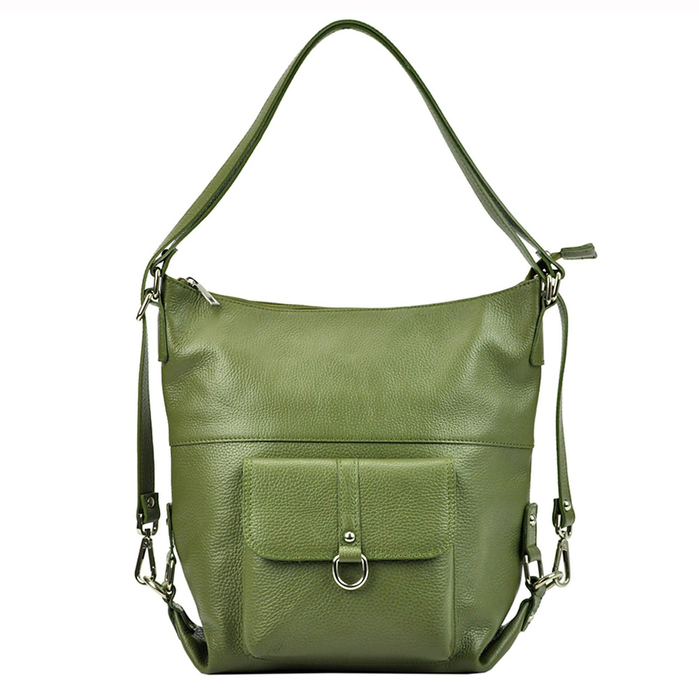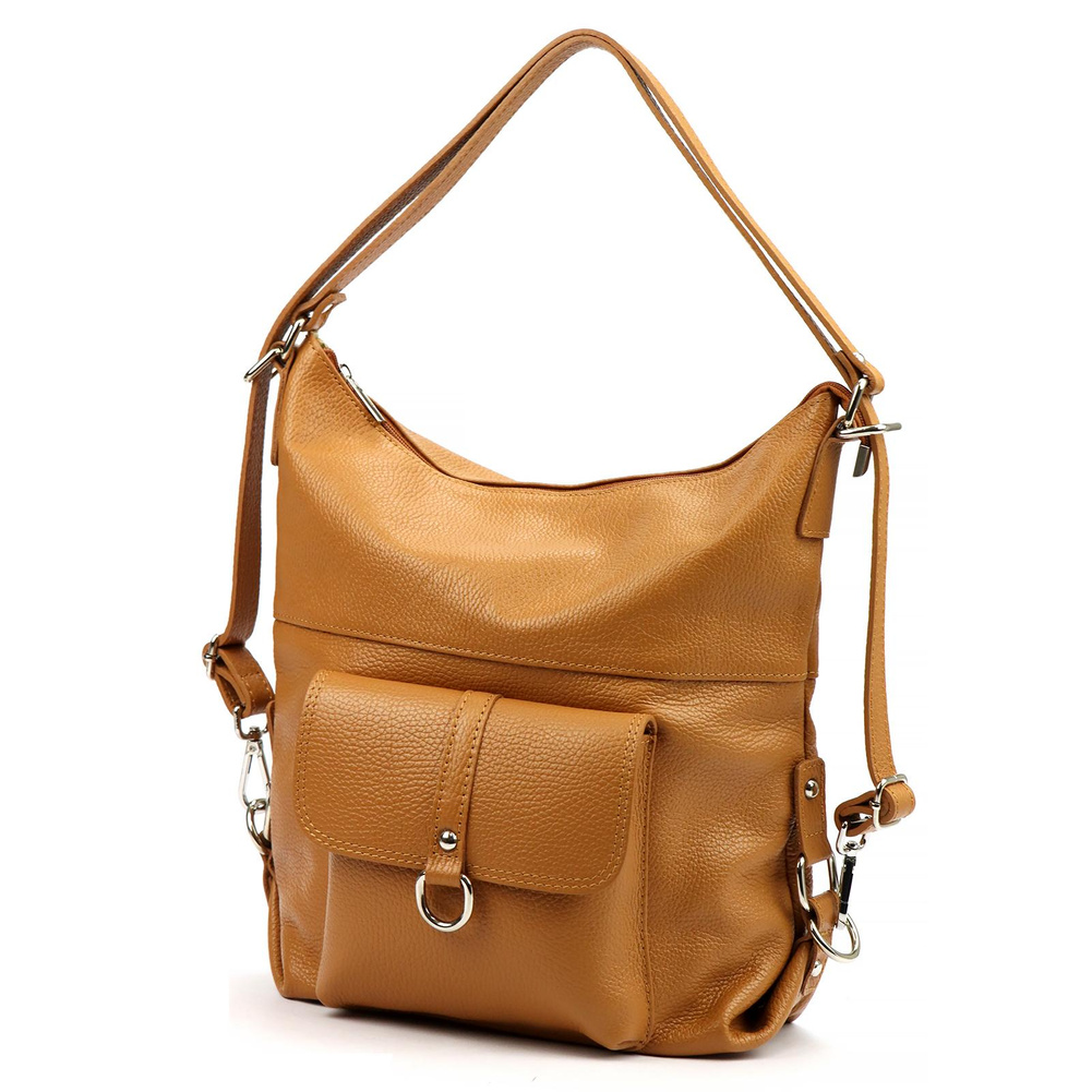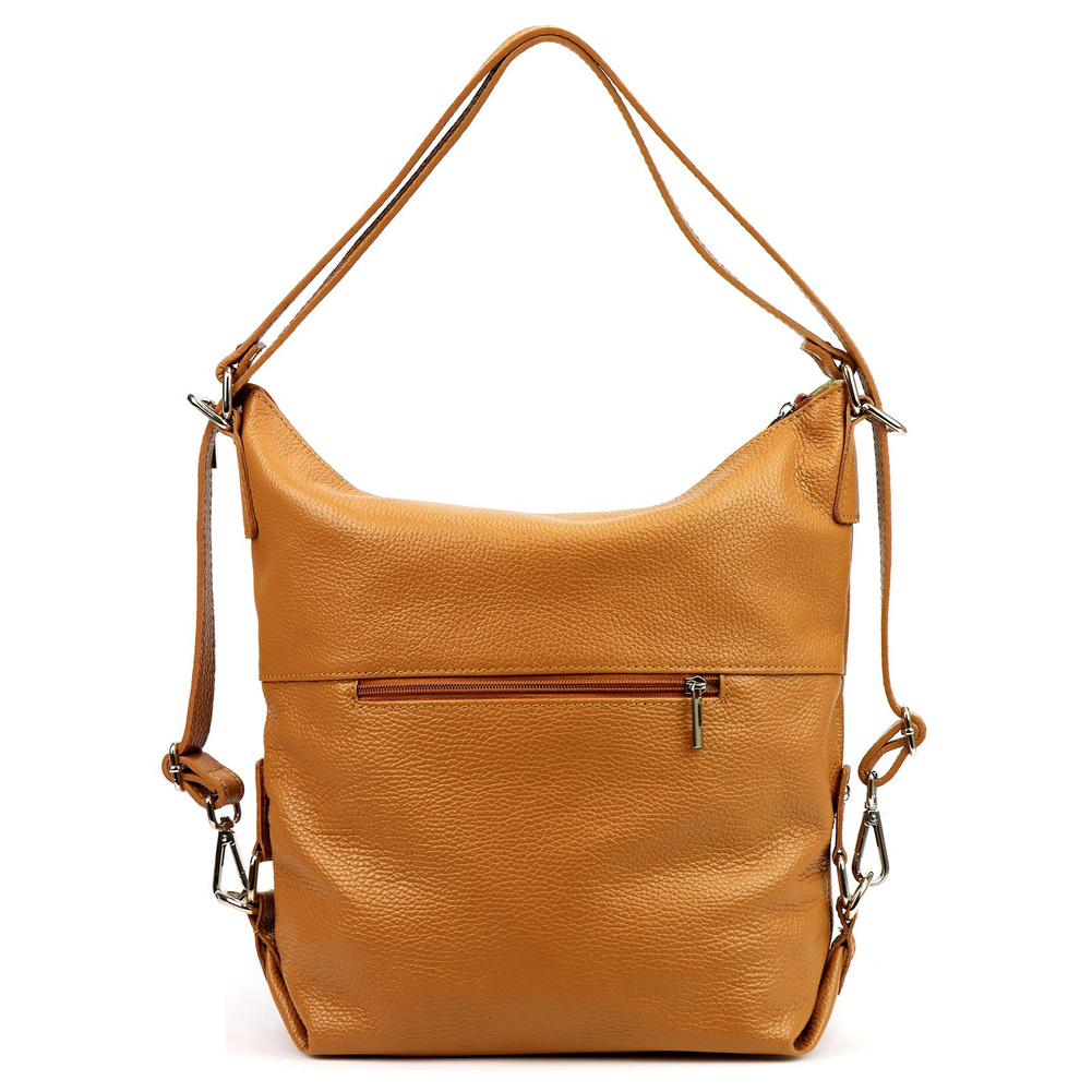 Pojemna, mieszcząca A4. torba z funkcją plecaka. Wykonana jest z najwyższej jakości, włoskiej, naturalnej skóry o wyrazistym "groszkowaniu". Konstrukcja torebki jest jednokomorowa. Wnętrze wykończono trwałą podszewką, w którą wszyto kieszeń-przegrodę, zapinaną na suwak. kieszonkę na telefon i kieszonkę na drobiazgi. Całość zamykana jest solidnym, metalowym zamkiem błyskawicznym. Paski tworzące uchwyt można przepiąć wydłużając je dwukrotnie lub też w ten sposób, by można było nosić torebkę jak plecak.
