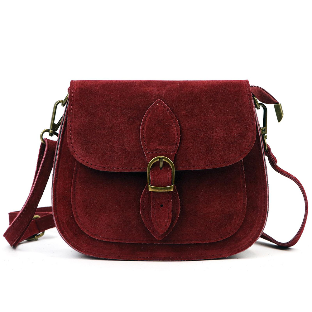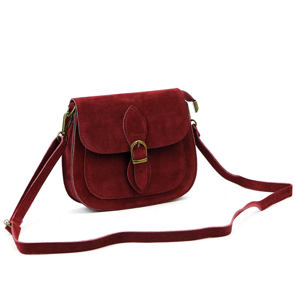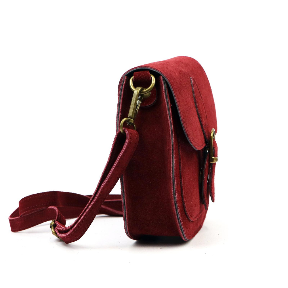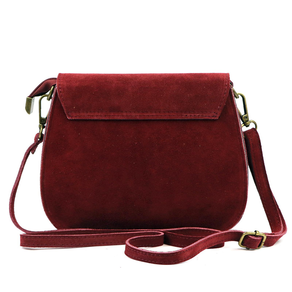 Mała torebka-listonoszka z naturalnej skóry zamszowej. Torebka ma budowę jednokomorową, wykończoną trwałą podszewką. Na froncie naszyta jest kieszeń, mieszcząca smartfon. Całość zamykana jest zamkiem błyskawicznym i klapą z zatrzaskiem magnetycznym. Długi pasek pozwala wygodnie nosić ją na ramieniu lub na ukos przez pierś.