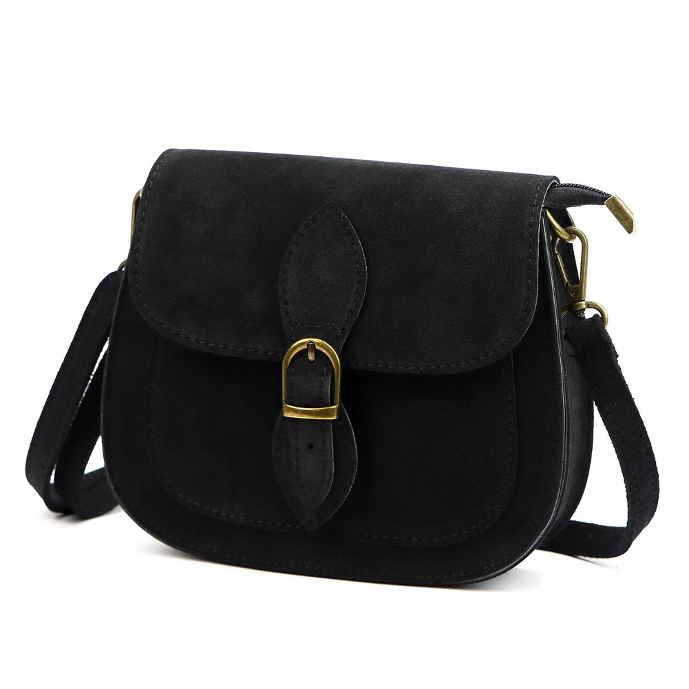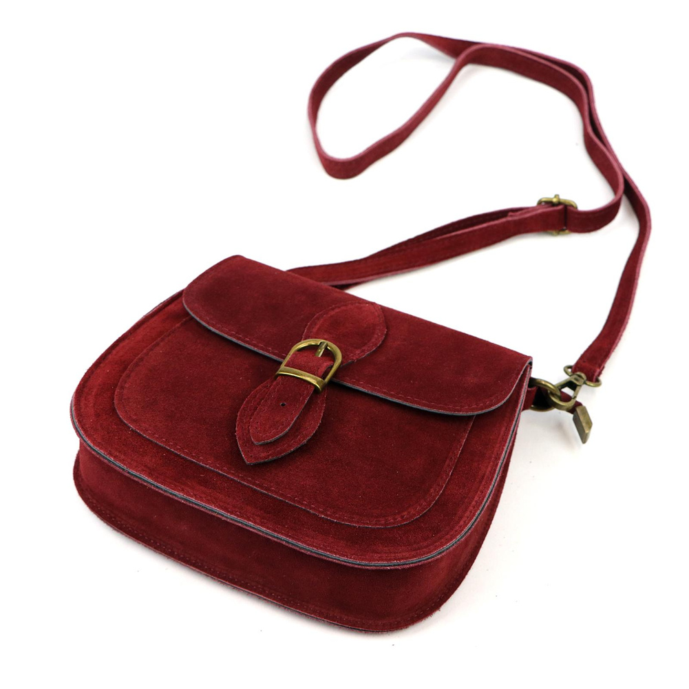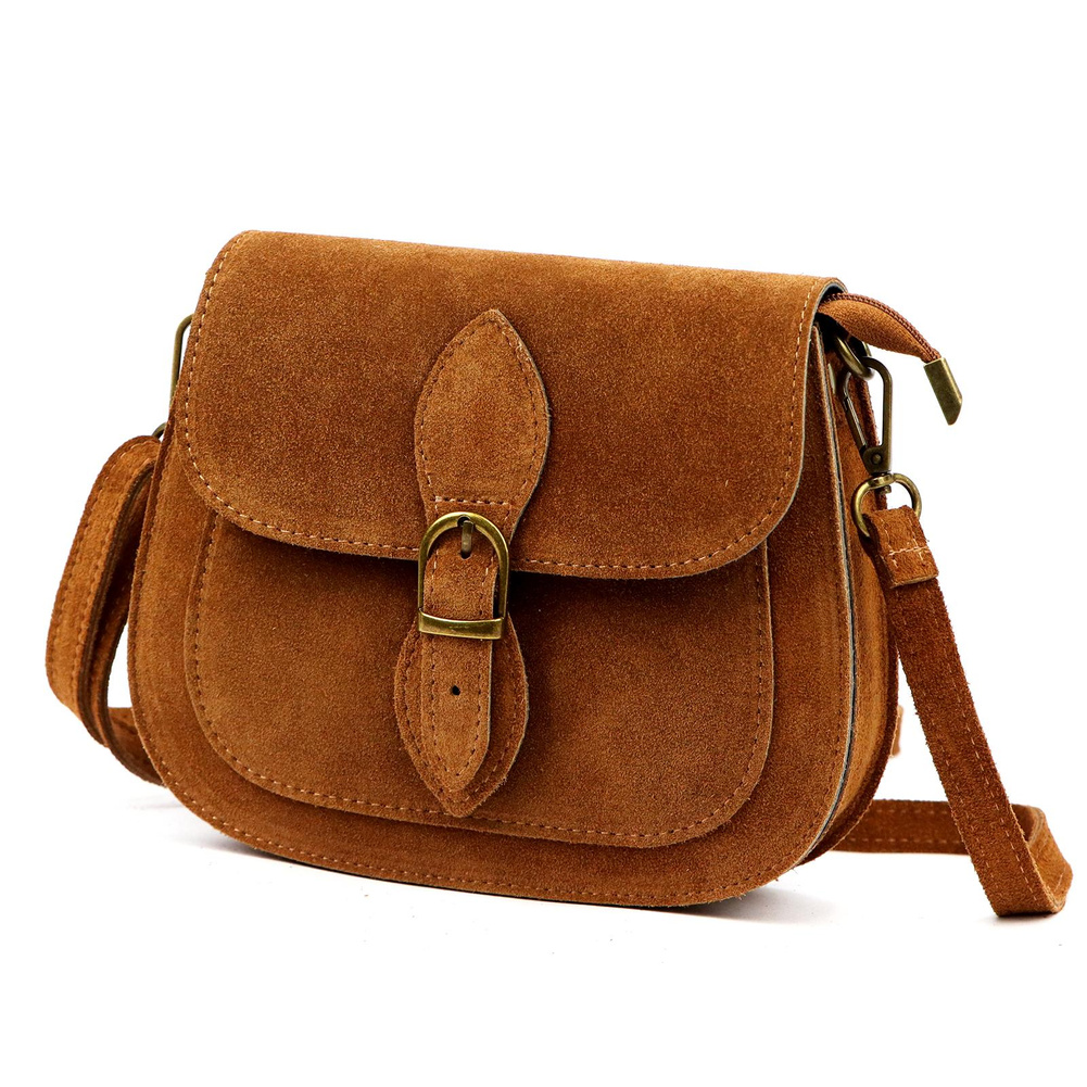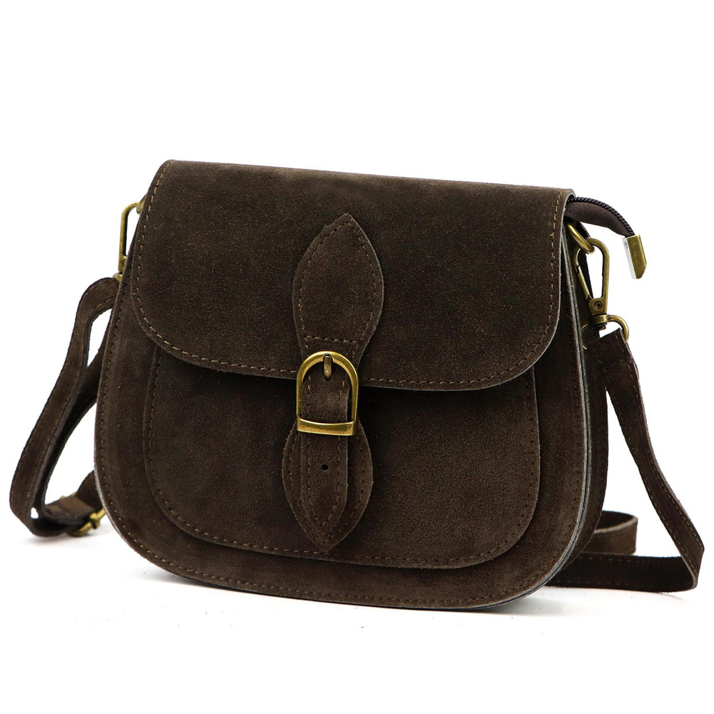 Mała torebka-listonoszka z naturalnej skóry zamszowej. Torebka ma budowę jednokomorową, wykończoną trwałą podszewką. Na froncie naszyta jest kieszeń, mieszcząca smartfon. Całość zamykana jest zamkiem błyskawicznym i klapą z zatrzaskiem magnetycznym. Długi pasek pozwala wygodnie nosić ją na ramieniu lub na ukos przez pierś.